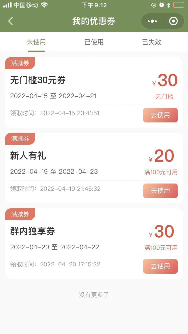 用户在积分商城通过积分兑换,或者在领券中心、在商家的微信群领到了优惠券之后,优惠券会出现在积分商城 - 我的 - 优惠券中。