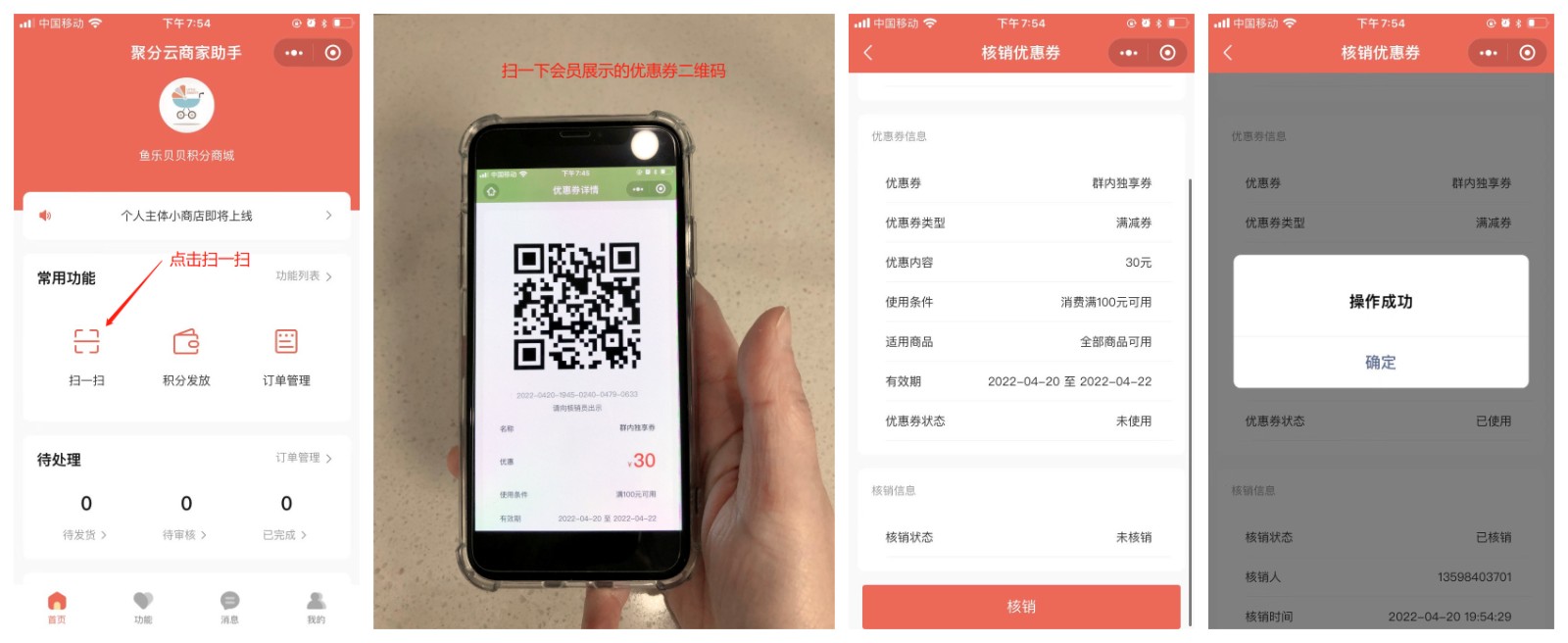使用PC端商家平台的商家账号即可登录,登录成功后,点击首页的扫一扫,扫会员展示的优惠券二维码, 即可快速核销。如下图: