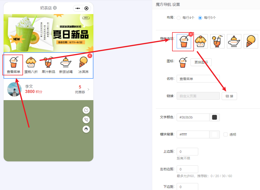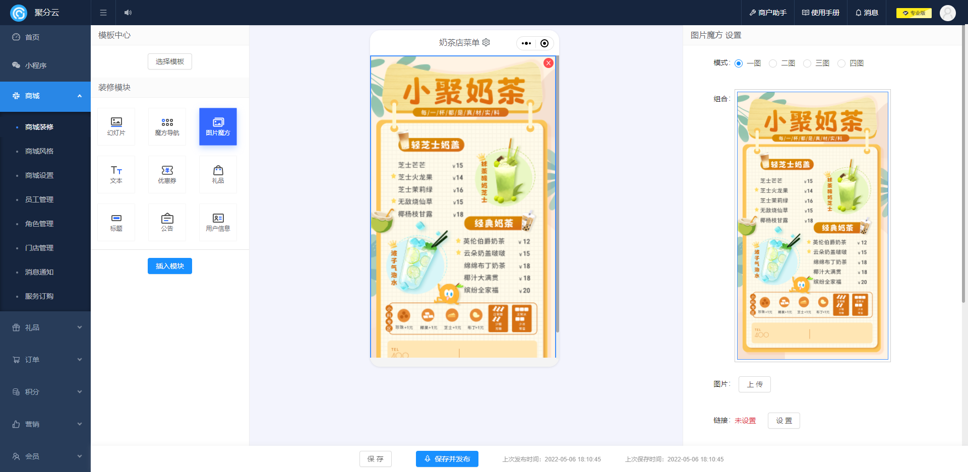 点击装修后,添加图片魔方模块,上传奶茶店菜单图片。